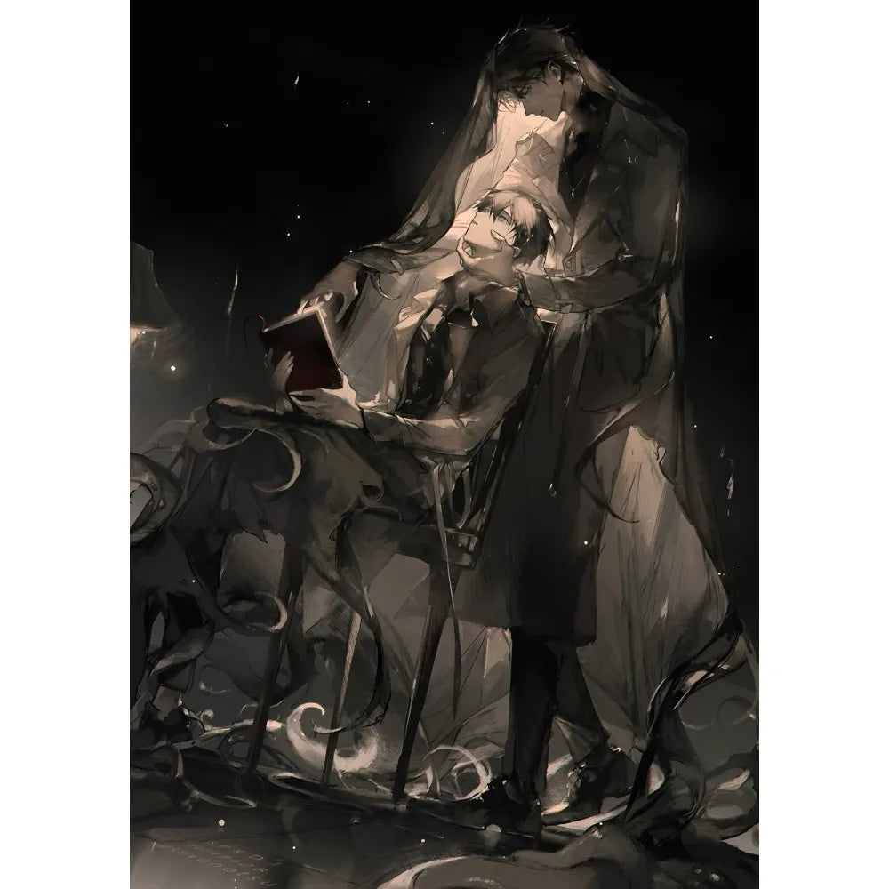 Dive into the mystical realm of Lord of the Mysteries with this stunning Klein Moretti poster, capturing a moment of eerie intimacy and supernatural awakening. As Klein reads under a dark veil, shadowy tentacles coil around him and a divine figure whispers secrets beyond human comprehension.